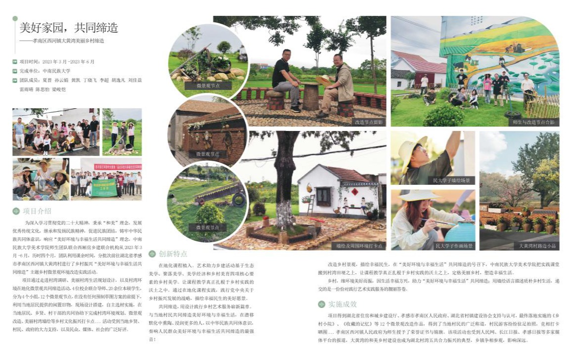 此次入选案例成果,是美术学院环境设计专业夏晋教授工作室师生团队联合西厢房乡建联合机构于2023年3月-6月间,利用课余时间完成的“美好环境与幸福生活共同缔造”主题乡村微景观环境改造实践活动之一。该项目通过走进村湾调研、美丽村湾生活规划设计,以及村湾环境在地化微景观共同缔造活动,基于生态美学、聚落美学、美学经济和乡村美育4项核心要素的乡村美学,将课程教学真正扎根于乡村实践的沃土之中。通过在地化课程实践,在没有任何预制草图方案的前提下,团队师生利用当地居民提供的闲置旧物,现场设计搭建,自主选材实施,在当地居民、乡贤、村干部的共同协助下完成村湾环境规划、微景观改造、美丽村湾墙绘等乡村文化振兴打卡点,描绘了幸福民生的美好愿景,得到了当地人民群众的一致好评。