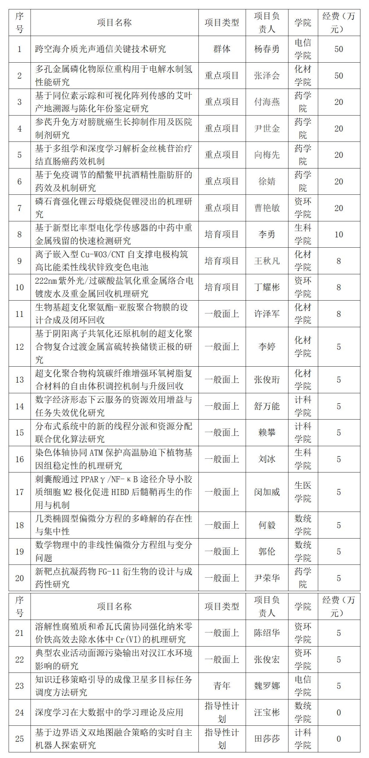 本年度必赢官网获批创新群体和重点项目立项数创历史新高。电子信息工程学院杨春勇教授申报的“跨空海介质光声通信关键技术研究”获批创新群体项目,该类项目是目前湖北省基础研究领域影响最大、竞争最激烈的人才团队类项目之一。此外,化学与材料科学学院张泽会,药学院付海燕、尹世金、向梅先、徐婧,资源与环境学院曹艳敏等6位老师获批重点项目。