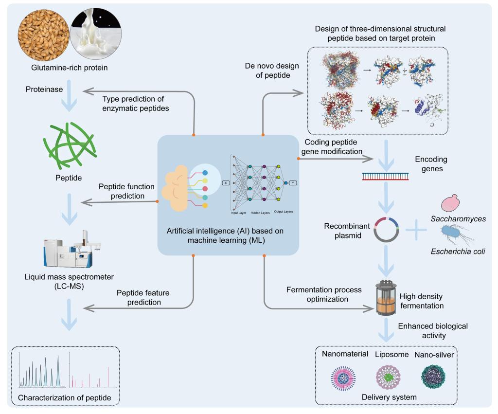 该综述特别探讨了人工智能(AI)和合成生物学在谷氨酰胺营养肽生产中的应用潜力,希望通过AI加速更多具有生物活性的谷氨酰胺营养肽的发现,并进一步对肽的结构进行优化,同时利用细胞工厂技术实现谷氨酰胺营养肽的生物制造。本文首次提出一个基于AI的多技术集成系统,将极大促进谷氨酰胺营养肽作为功能性食品原料的研究进程,同时为其他功能性肽的智能制造提供范式,为未来功能性食品的开发提供重要的理论和实践支持,将极大促进大健康产业的发展与升级。
