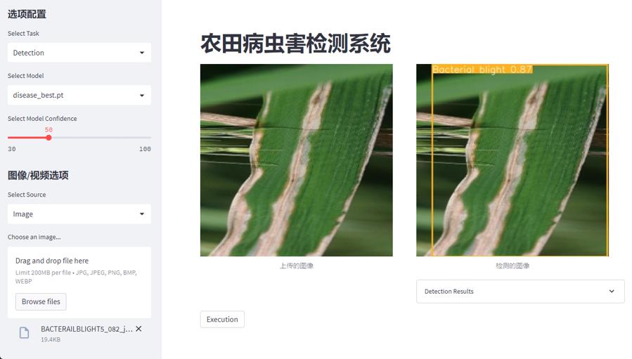杨杨同学的论文题为An Improved YOLOv8-Based Rice Pest and Disease Detection。他的研究工作关注现阶段的基于深度学习的方法对农作物病虫害检测存在检测精度低、速度慢、部署困难且漏检率高的问题,提出了一种改进的病虫害检测模型 YOLOv8-HSFPN。图1为该模型在水稻病虫害上的识别结果;图2为基于该模型设计并开发的基于Web端的农田病虫害检测系统,方便相关人员通过网络便捷、实时进行农田病虫害识别和监测。