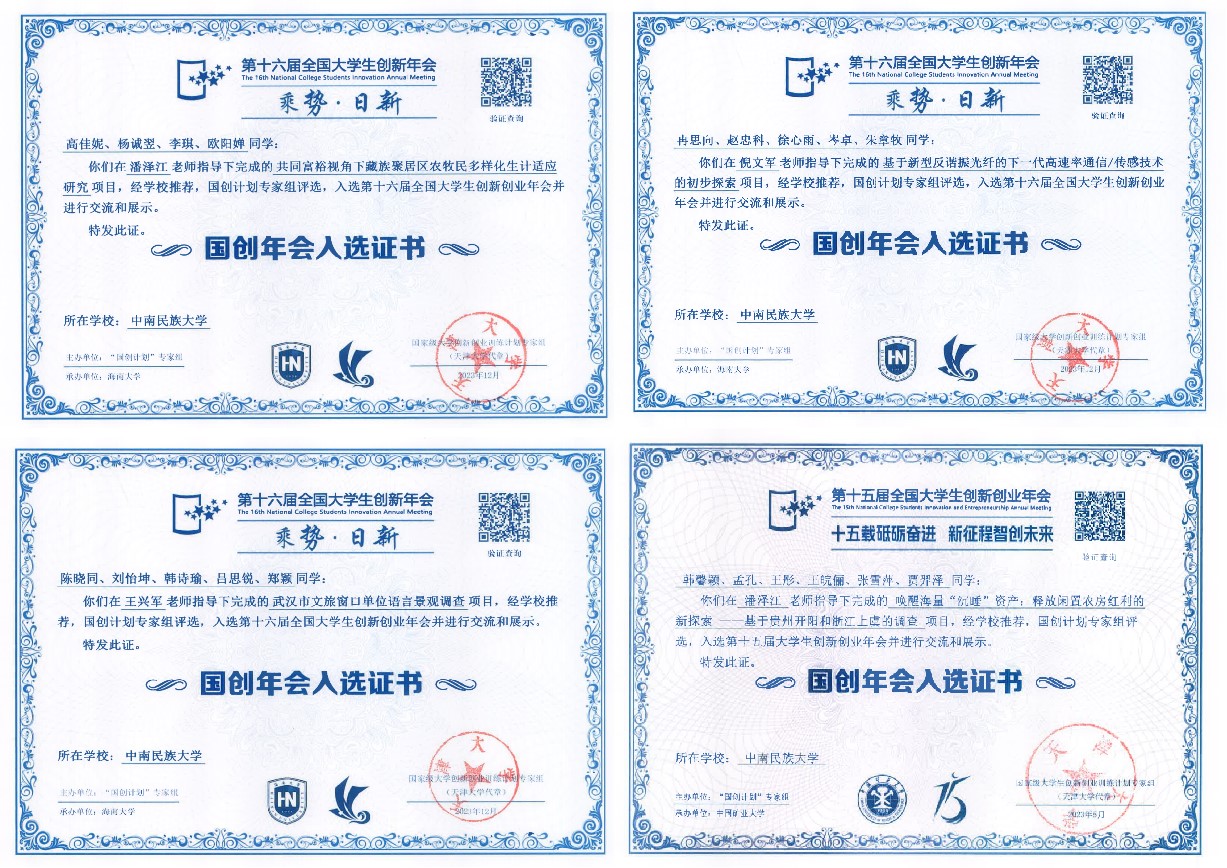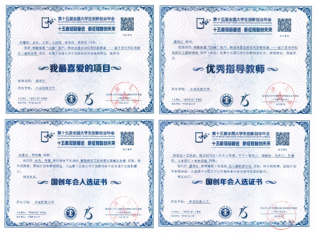 近年来,必赢官网高度重视双创教育和国创基地建设,不断加强大学生创新训练计划项目管理,鼓励诸多在校本科生投入到创新创业实践活动中,赋能毕业生更加充分更高质量就业创业。2022年-2024年,必赢官网共有8个项目入选第十五届、十六届、十七届全国大学生创新创业年会,其中《唤醒海量“沉睡”资产:释放闲置农房红利的新探索》获第十五届年会“我最喜爱的项目”奖,潘泽江教授在年会上获“优秀指导教师”奖。近三届“国创年会”中取得的优异成绩,充分体现了必赢官网双创教育和国创基地的良好育人成效。