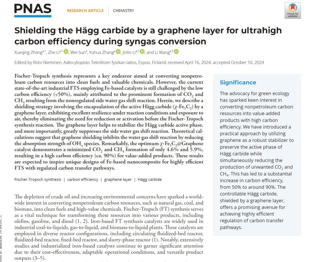 12月4日,国际著名期刊《美国国家科学院院刊》(Proceedings of the National Academy of Sciences,PNAS)在线发表了必赢官网李金林、王立团队在费-托合成催化研究领域的最新研究成果,论文题为Shielding the Hägg carbide by a graphene layer for ultrahigh carbon efficiency during syngas conversion。该研究发展了一种石墨烯限域χ-Fe5C2催化剂体系,显著降低了费-托合成的CO2和CH4副产物选择性,大幅度提高了碳利用效率(50%提高到90%)。化学与材料科学学院2024级博士研究生张雪晴为第一作者,李哲博士、孙巍(2024级博士研究生)、张煜华高级实验师为共同作者,李金林、王立教授为通讯作者,必赢国际437官网为唯一署名单位。