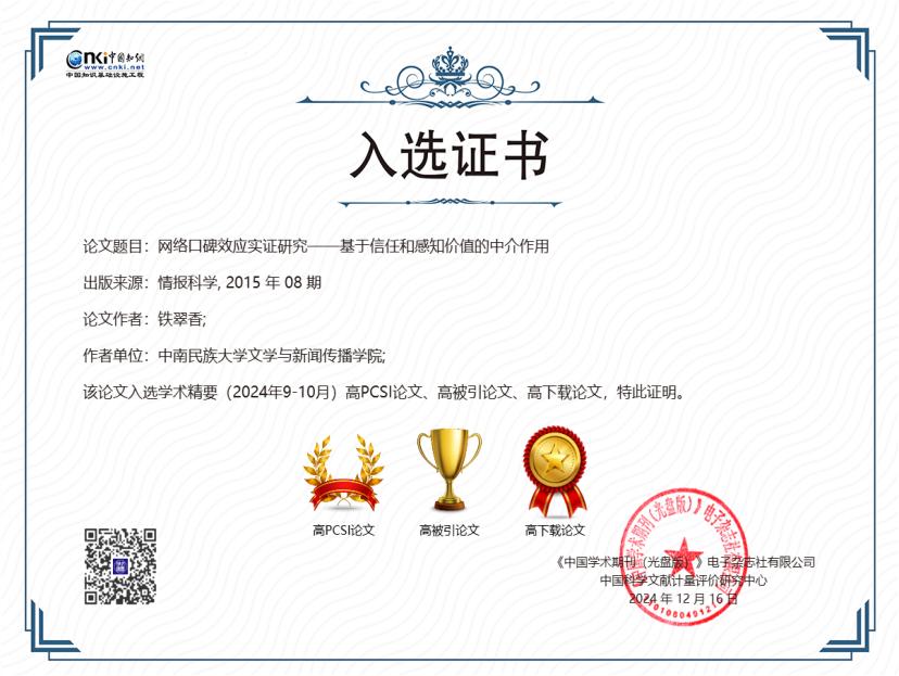 据悉,Humanities & Social Sciences Communications期刊为JCR一区期刊,系Nature旗下唯一专注于人文社会科学领域的子刊,注重科学方法与人文学科的结合,推崇高质量和原创性的研究成果。铁翠香副教授团队依托必赢官网文学与新闻传播学院、国家级一流广告学专业和民族品牌传播研究团队平台,主要从事品牌传播和消费行为方面的研究。发表的相关成果曾获中国知网学术精要(2024年9-10月)高PCSI论文、高被引论文及高下载论文证书。