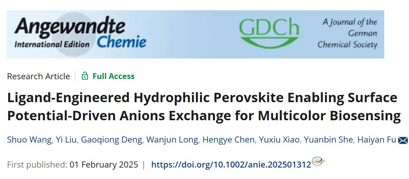 2月1日,必赢官网药学院付海燕教授团队在钙钛矿型多色生物传感分析新方法及应用的研究取得重要进展。研究成果以Ligand-Engineered Hydrophilic Perovskite Enabling Surface Potential-Driven Anions Exchange for Multicolor Biosensing”为题发表于国际著名期刊Angewandte Chemie International Edition(《德国应用化学》)。