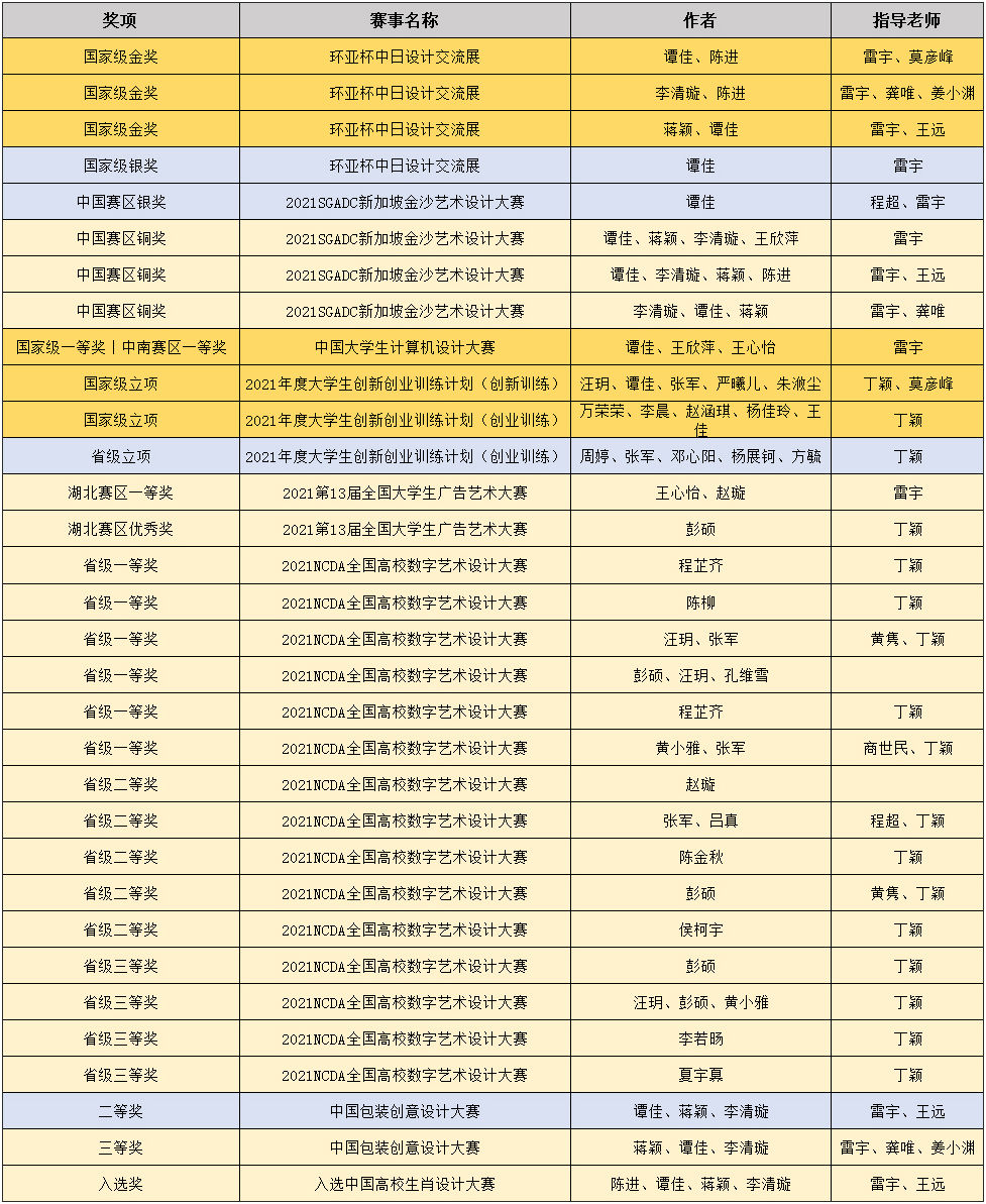 近日,2021年上半年各类重要设计大赛获奖名单陆续公布,美术学院“雷宇丁颖设计工作室”学生成果丰硕,共获国家级金奖/一等奖4项、国家级银奖/二等奖3项、国家级铜奖/三等奖4项、省级一等奖7项,获2021年度大学生创新创业训练计划国家级立项2项、省级立项1项。