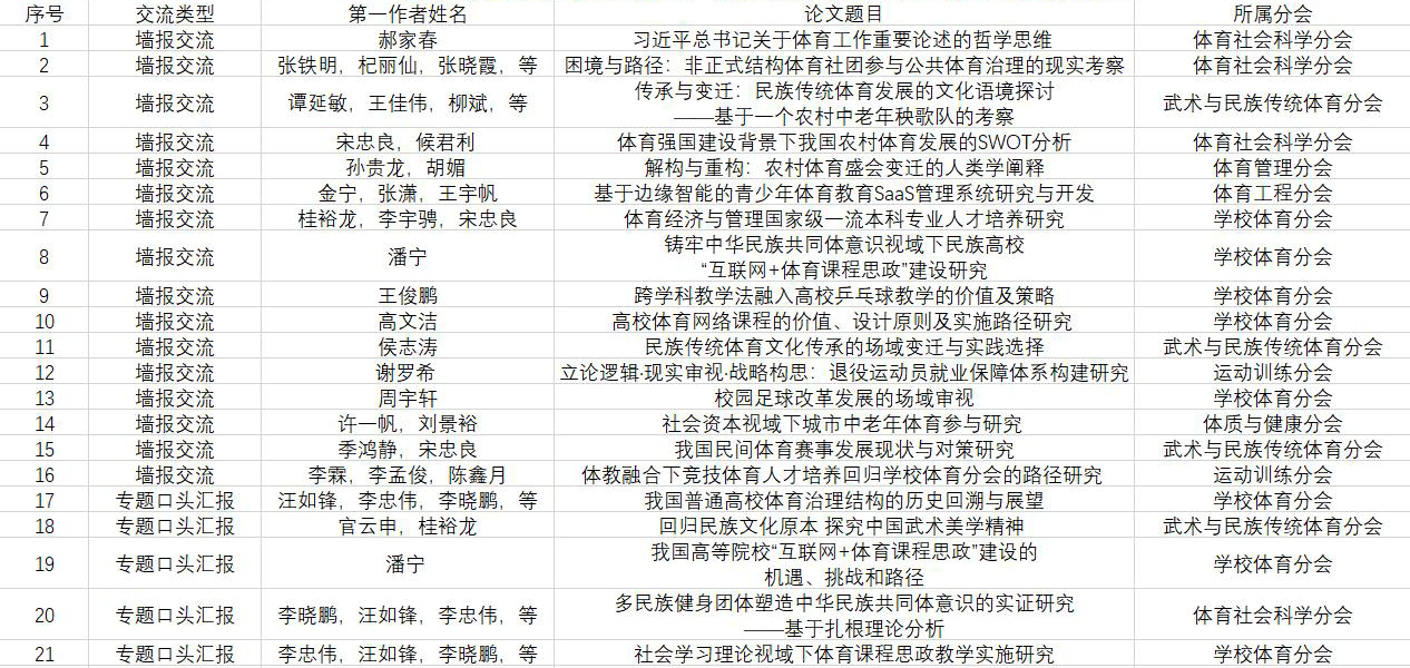 9月30日,第十二届全国体育科学大会论文录用结果发布。必赢官网体育学院师生21篇论文获录用,其中专题口头汇报5篇,墙报交流16篇,录用篇数在全国民族院校和湖北省高校中均位居前列,全国高校排名第51位。