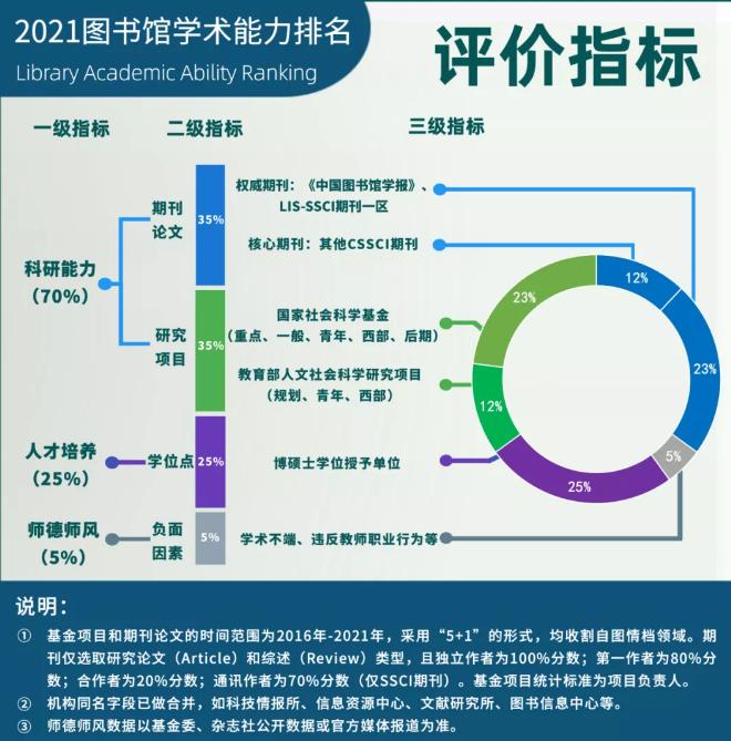 图书馆学术能力排名是首个针对图书馆学术竞争力水平进行综合评价的指数。评价体系涵盖科研能力、人才培养和师德师风在内的3大类10个细分数据类型,使用的均为最能体现图书馆学术水准的量化元指标,并采取期刊+作者综合权重的方式,旨在给出一个具有对标基准、多层次、分权重、符合业界特色的综合评议依据。