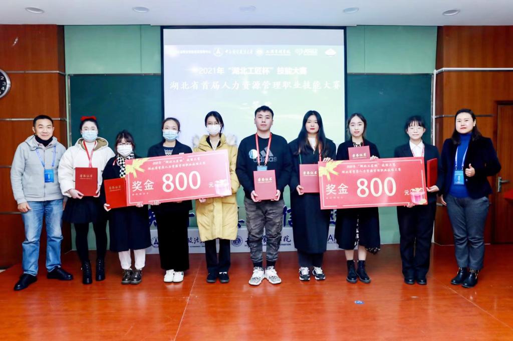 焦晴雨(右三)参加湖北省“工匠杯”人力资源管理职业技能大赛获奖后与同学合影。