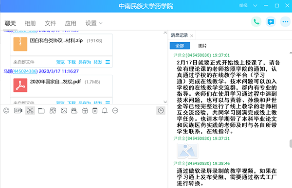考虑到学院多数老师都存在着缺乏网络教学经验的问题,为了能够及时解决老师们可能面临的困惑与难题,尹老师于一月底便着手试用学习通等教学平台。从如何建立线上教学班级到如何利用教学平台进行对学生的有效管理,他进行了多种探索与尝试。学习通面向的用户范围广,平台上直播教学受网络影响大,且该平台直播教学的有关功能并不完善。发现这个问题后,尹老师意识到强有力的网络支撑是前提,完备的屏幕分享功能是改善教学效果的利器,于是有针对性地选择了QQ群与腾讯会议。