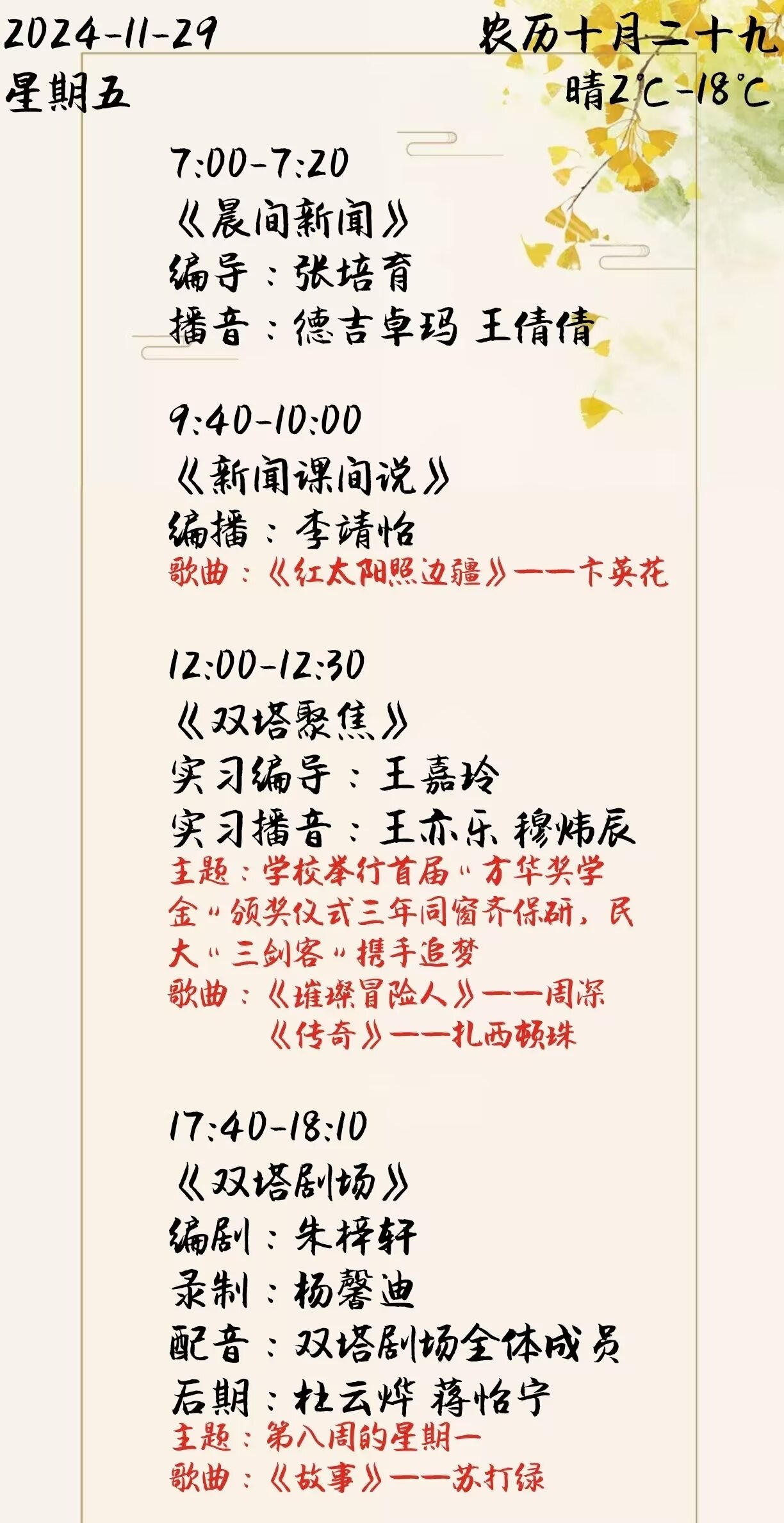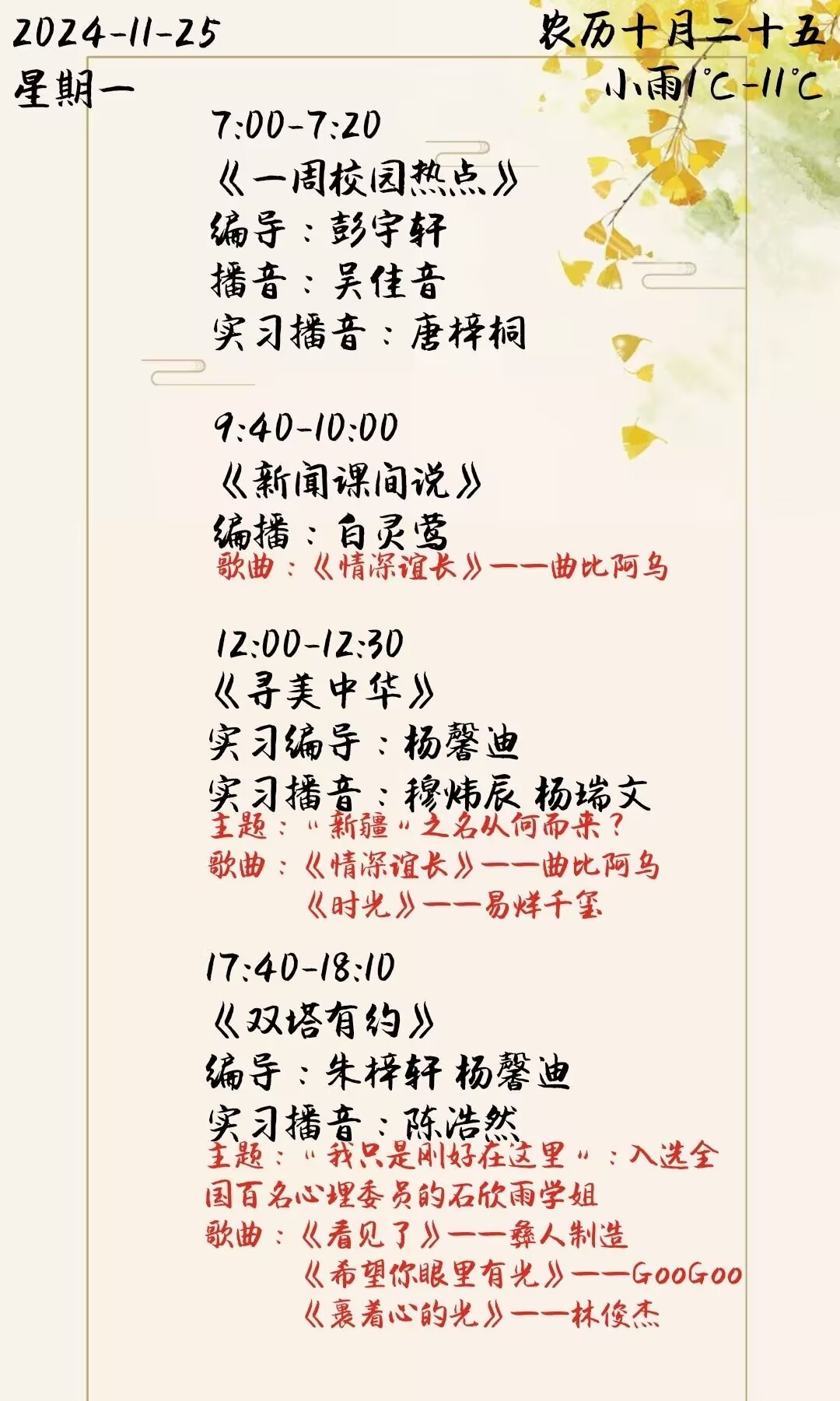 上一篇: 双塔之声2024年第二学期第14周节目单(2024.12.2-12.6)