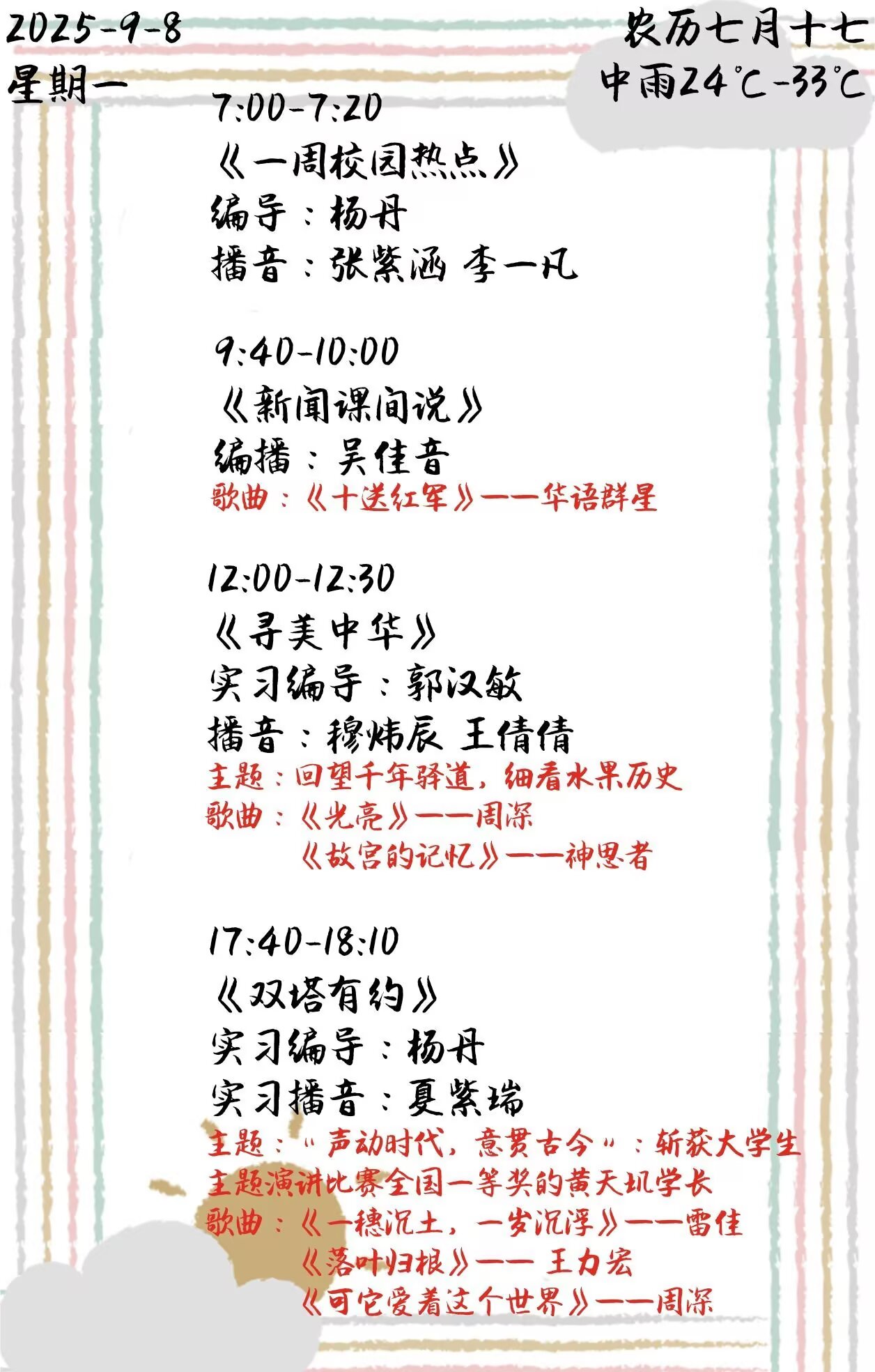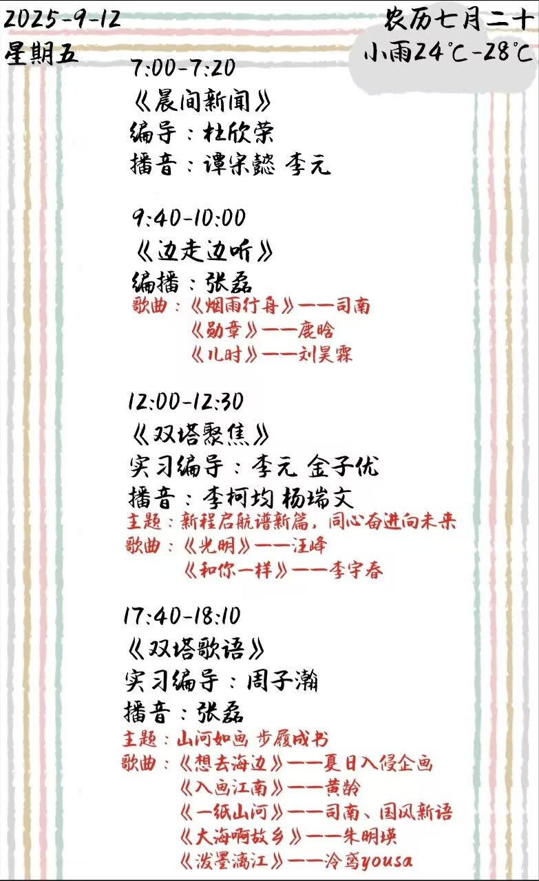 上一篇: 双塔之声2025年第二学期第2周节目单(2025.9.15-9.19)