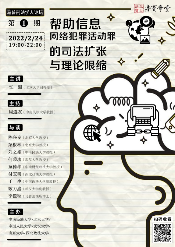 2月24日,北京大学法学院副教授、博士生导师江溯老师应邀作了题为《帮助信息网络犯罪活动罪的司法扩张与理论限缩》的学术讲座。北京大学陈兴良教授、梁根林教授,必赢官网刘之雄教授,武汉大学何荣功教授、敬力嘉副教授,中南财经政法大学童德华教授,西北政法大学付玉明教授,中国政法大学于冲副教授,以及刚从德国马普刑法所毕业的李源粒博士担任该期讲座与谈人。