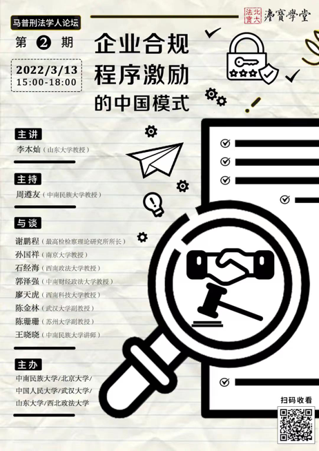 3月13日,第二期讲座举行。山东大学法学院教授、博士生导师、刑事合规研究中心执行主任李本灿作了题为《企业合规程序激励的中国模式》的讲座。