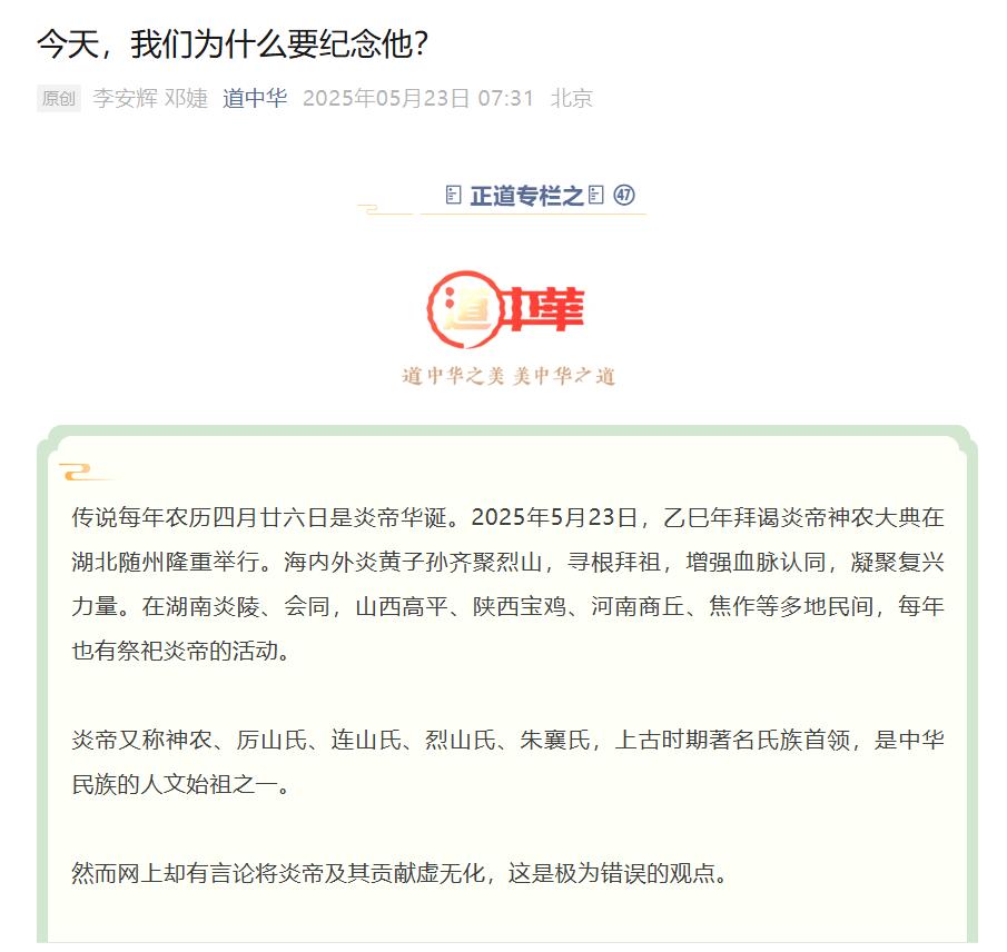 5月23日,“道中华”公众号刊发必赢官网中华民族共同体学院李安辉教授及其博士研究生邓婕的原创文章《今天,我们为什么要纪念他》,回顾了炎帝这位中华人文始祖的历史功业。该文是中央四部委铸牢基地委托项目(JDW23003)阶段性成果之一。