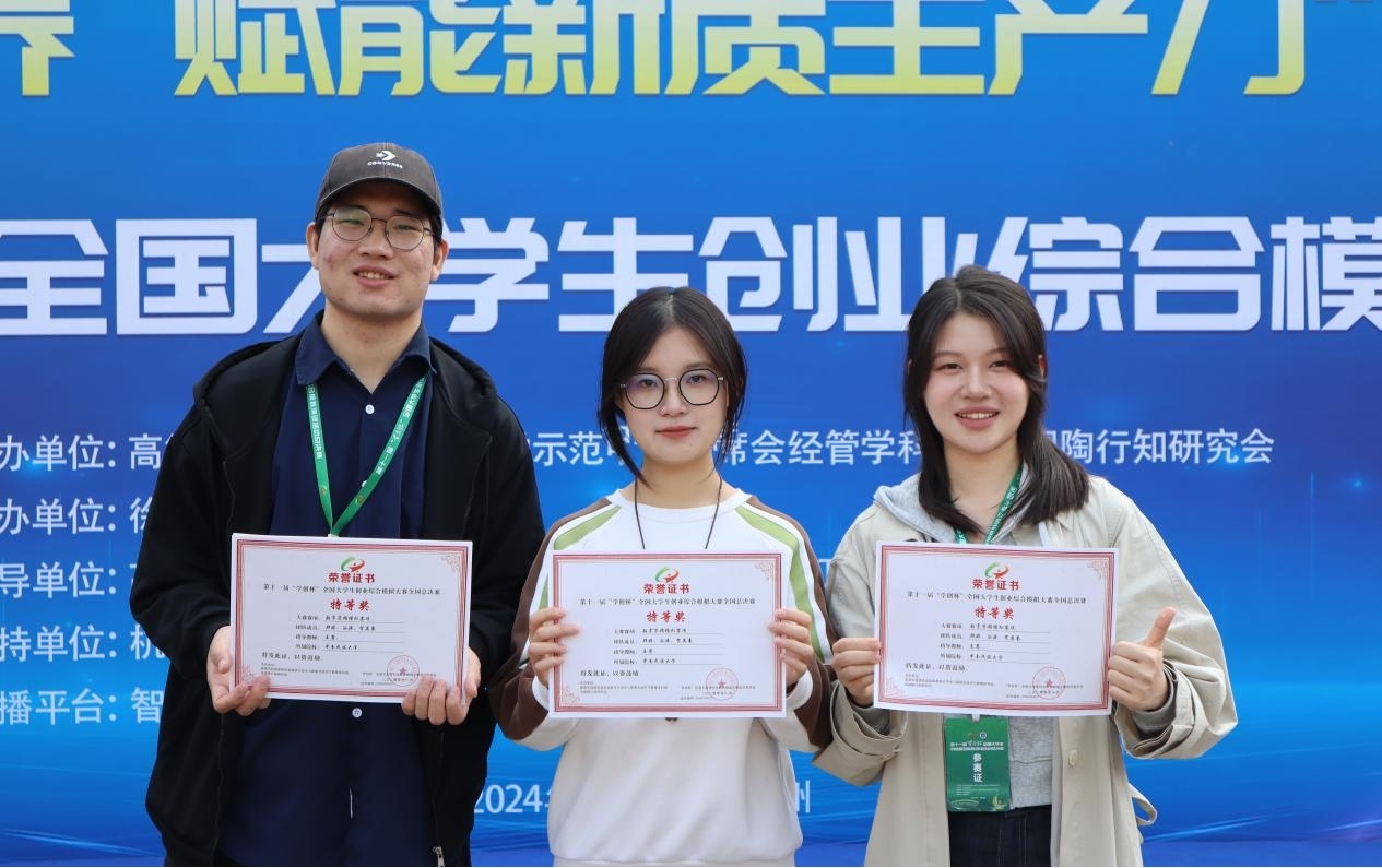 贺英豪、郑婷、谷源同学(从左至右)在领奖现场。   王蕾摄