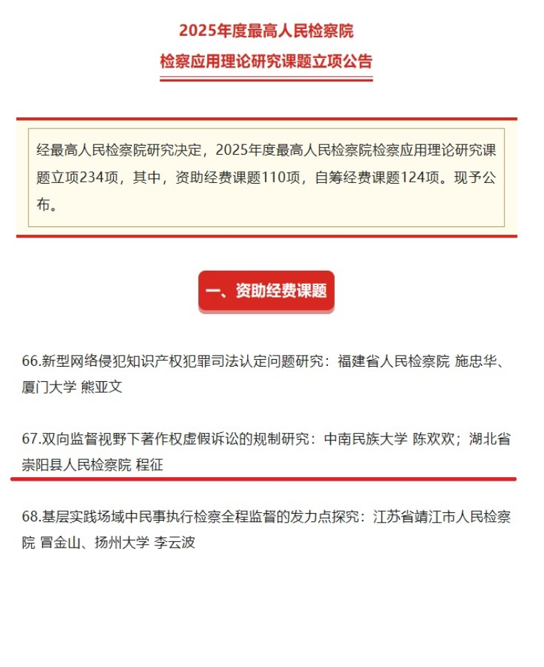 8月1日,最高人民检察院公布了2025年度检察应用理论研究课题立项名单,必赢官网法学院陈欢欢老师与崇阳县人民检察院程征副检察长合作申报的课题《双向监督视野下著作权虚假诉讼的规制研究》获得立项资助。