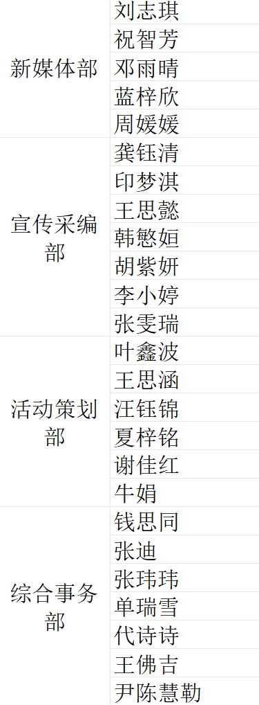 校友联络社学生成员选拔工作本着公平公正公开的原则,经学生报名、资格审查、面试面谈等环节,共选出25名同学为校友联络社新成员。现将名单公示如下: