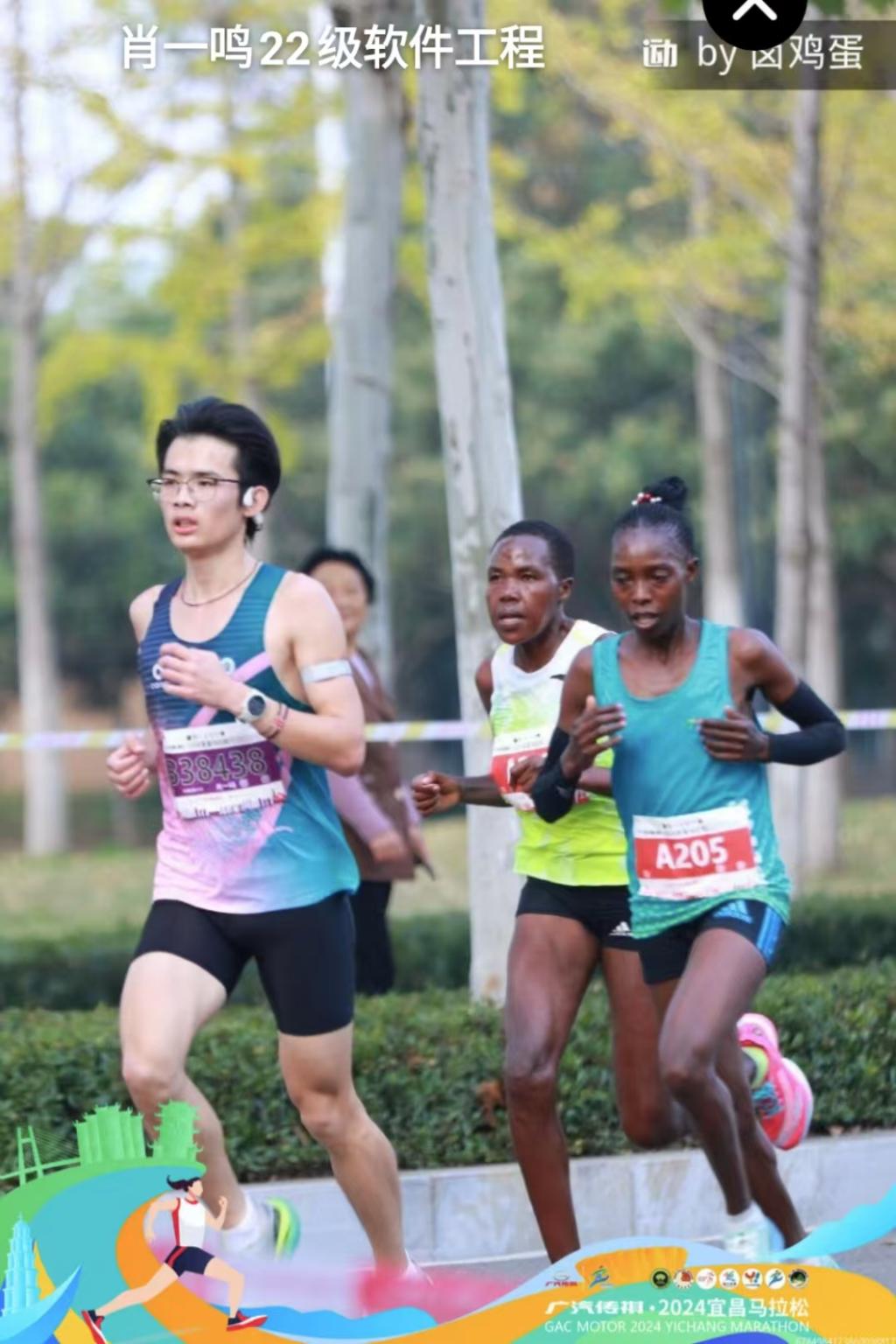 22级在校生软件工程专业肖一鸣在比赛中也是健步如飞一度领跑半程马拉松第一集团军十公里并以1小时18分的优异成绩完赛半程马拉松。