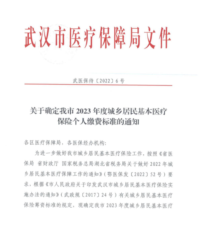 关于确定我市2023年度城乡居民基本医疗保险个人缴费标准的通知(武医保待〔2022〕6号)
