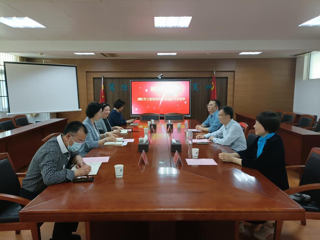 3月26日下午,武汉市第三医院副院长张武昌率重症医学科主任付守芝、社会服务部主任赵晓牧等一行莅临我院开展座谈交流。校党委委员、总会计师包莉娜、校医院院长龚艳、副院长唐晓、邱文辉等对各位专家的到来表示热烈欢迎。