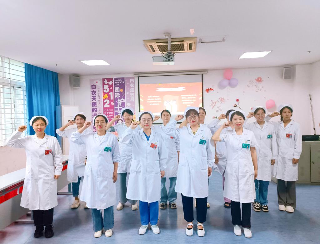 护士长徐佳妮带领护士团队重温南丁格尔誓言。“余谨以至诚宣誓:终身纯洁,忠贞职守。尽力提高护理之标准,勿为有损之事,勿取服或故用有害之药。慎守病人家务及秘密。竭诚协助医生之诊治,务谋病者之福利。谨誓!”铿锵有力的南丁格尔誓言激荡起护士们坚定的使命感和责任感,是护士们对护理事业从一而终、忠诚奉献的庄严宣告。