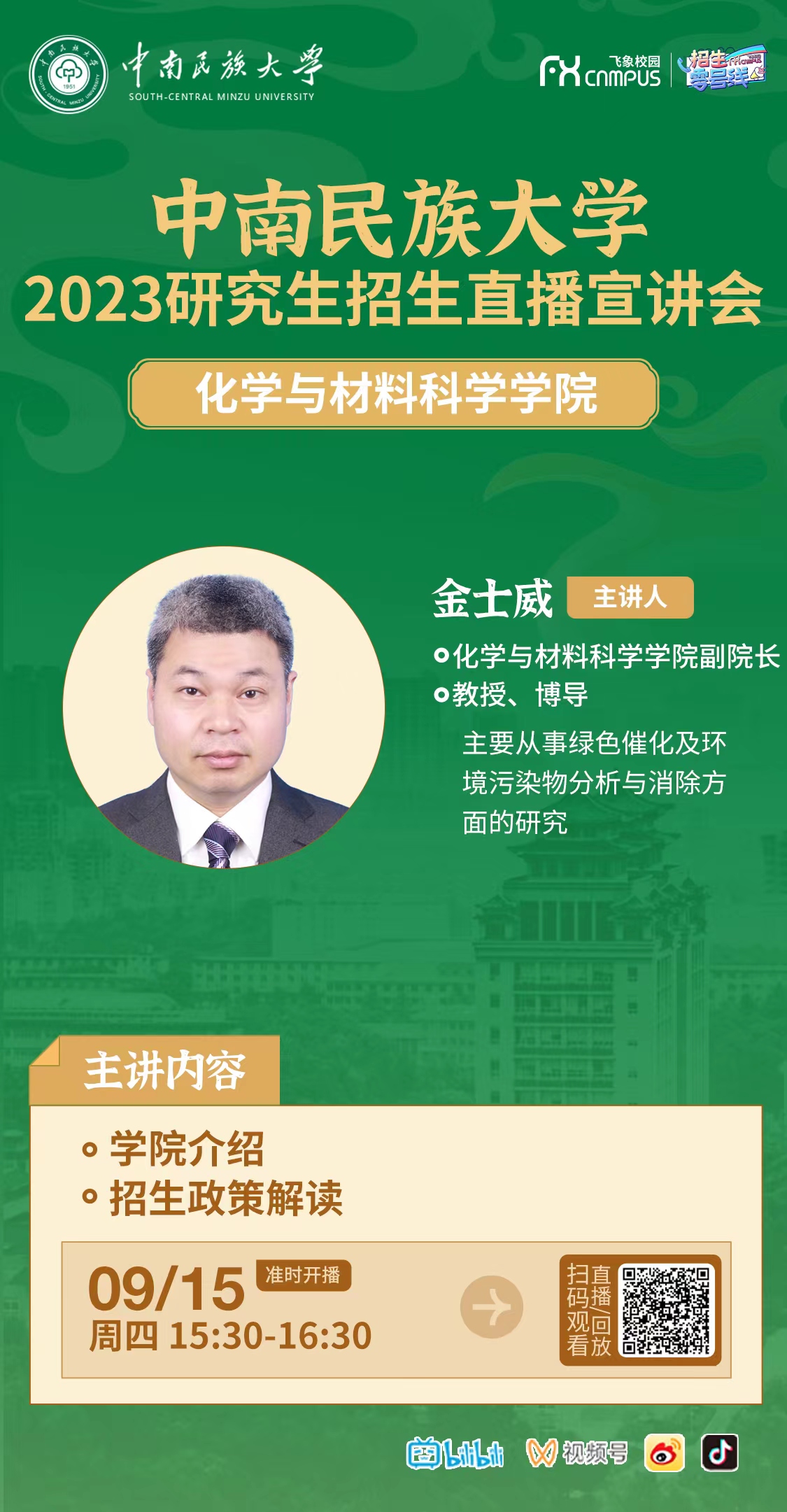 必赢国际437官网2023年研究生招生线上系列宣讲会之二------化学与材料科学学院专场(9月15日 15:30)