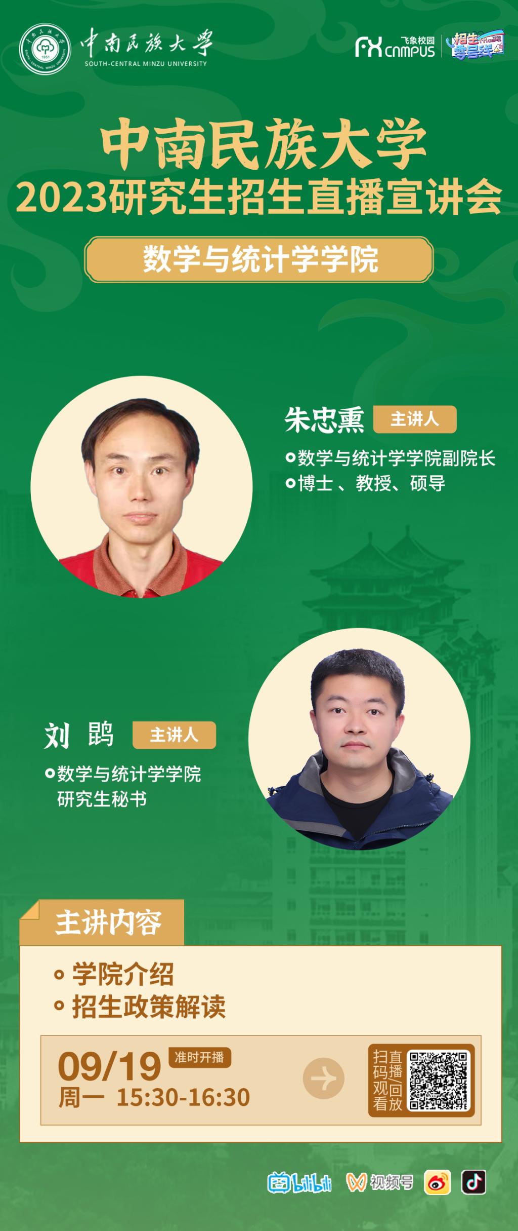 必赢国际437官网2023年研究生招生线上系列宣讲会之三------数学与统计学学院专场(9月19日 15:30)