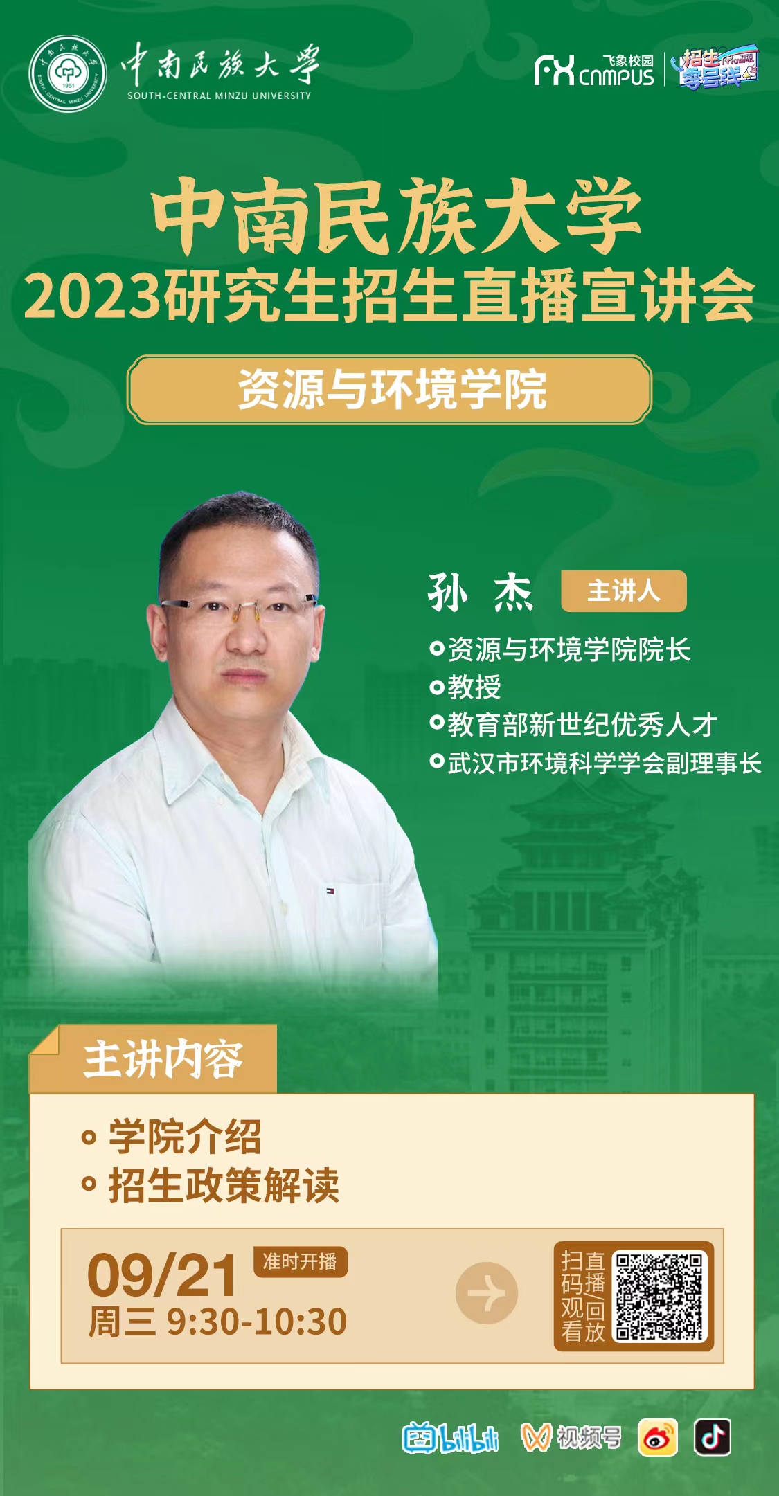 必赢国际437官网2023年研究生招生线上系列宣讲会之六------资源与环境学院专场(9月21日 9:30)