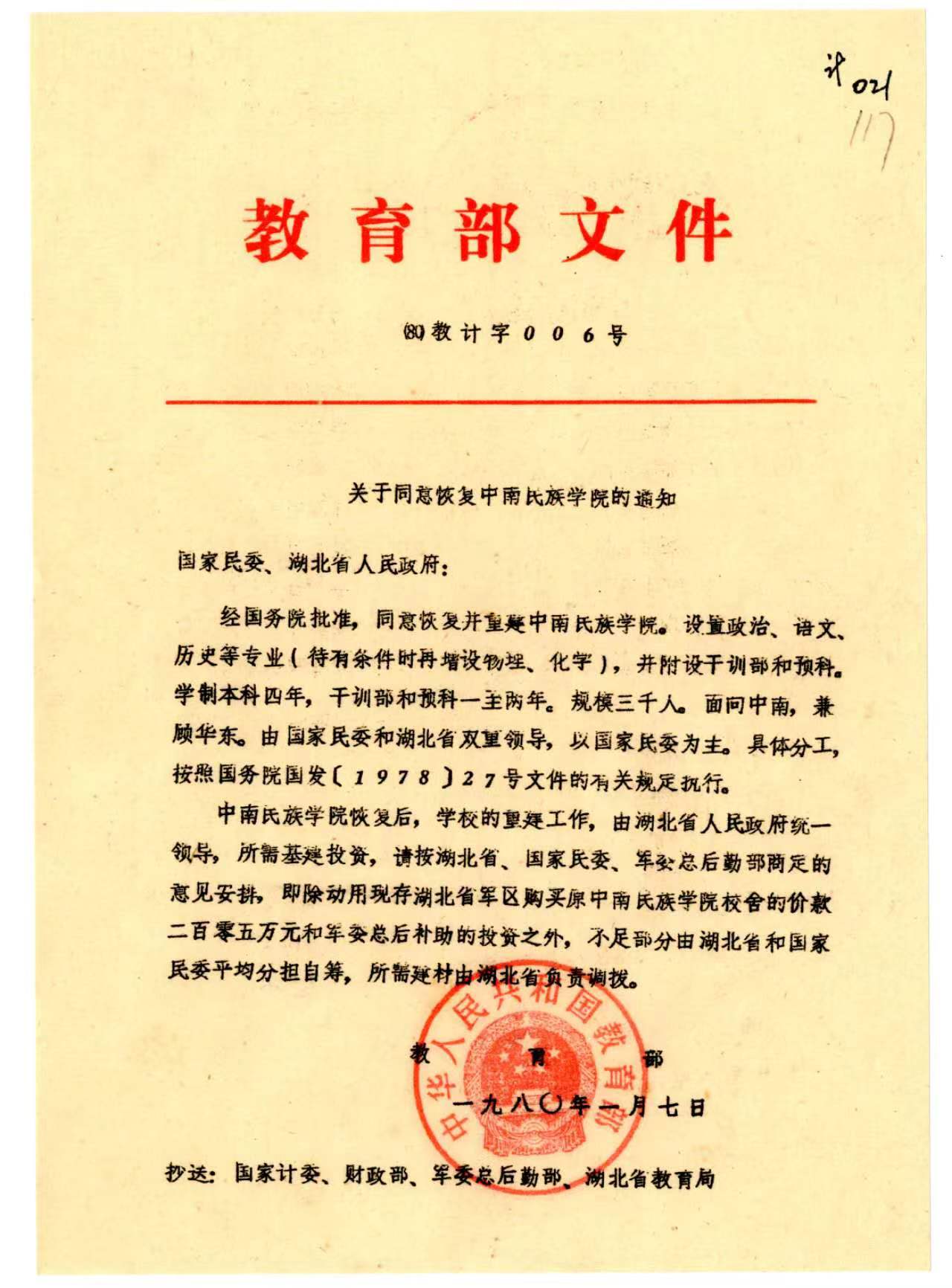 四、恢复提高期(1981——2005): 1980年,随着中南民族学院的恢复重建,预科同时复办,正式命名为大学预科部,生源从全国高考统一招生中录取。