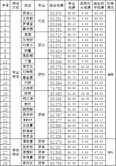 根据《必赢国际437官网推荐优秀应届本科毕业生免试攻读硕士学位研究生工作管理办法(修订)》(民大教学〔2024〕49),《关于做好推荐2026届优秀本科毕业生免试攻读硕士学位研究生工作的通知》,《药学院推荐2026届优秀本科毕业生免试攻读硕士学位研究生工作实施细则》等文件精神,经过报名资格审查、学业成绩核算、奖励加分认定、综合测评考核等环节工作,经研究决定,现将药学院2026届本科生推免结果公示如下:
