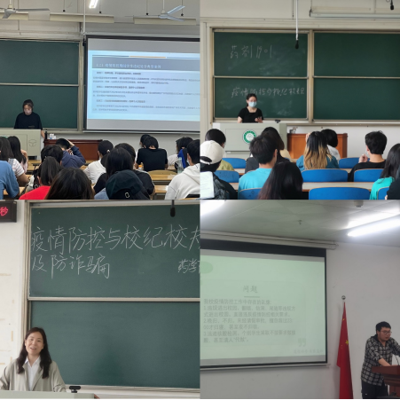 在各班班会上,班导师强调国内外疫情防控形势依然严峻,大家要自觉遵守学校的防疫政策,做到无事不外出、出门戴口罩。加强身体锻炼和注重饮食健康,注意个人卫生和宿舍环境整洁,尽量减少网络购物,拿到快递包裹注意消毒,特别提醒同学们自觉完成核酸检测。老师们指出校纪校规是每位同学必须牢记于心的行为准则,要遵守校规校纪,在疫情常态化防控下对自己和他人的生命健康负责。