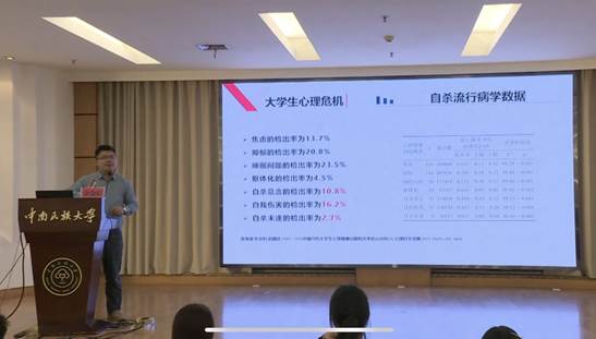 余金聪老师从“大学生心理危机概况”、“大学生自杀的识别”、“大学生自杀的应对”及“重点关注人群的特征”等四个方面深入讲解了心理危机识别和应对的核心要点。他强调,心理委员和寝室长要具备观察、倾听与沟通的能力,留意身边同学的细微变化,做到及时发现潜在的心理危机,成为同学们“有心的支持者”。