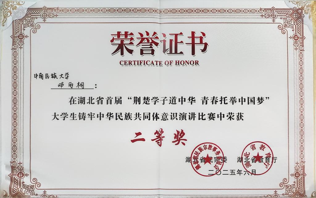 湖北省首届“荆楚学子道中华,青春托举中国梦”大学生铸牢中华民族共同体意识演讲比赛由省民宗委、省教育厅联合主办,旨在深入展示荆楚大地中华民族多元一体内涵和文化基因,鼓励大学生讲好中华民族共同体故事、中华文化故事、各民族交往交流交融互鉴故事,为构建中华民族共有精神家园和加快建成中部地区崛起的重要战略支点贡献力量。本次比赛吸引了全省各高校众多学生积极参与,经过层层选拔,共有来自全省40所高校的优秀选手进入决赛。邓雨桐同学作为必赢官网推荐的参赛选手,以其独特的视角、真挚的情感和精湛的演讲技巧,成功入围决赛。