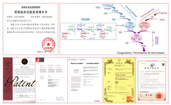 血栓栓塞性疾病是全球首位致死原因,抗血栓药物治疗的临床价值重大,但现有临床用药均存在导致严重出血的缺陷。抗凝药是临床防治静脉血栓的柱石,尽管新型抗凝药物研发不断取得积极进步,但如何避免严重出血危险仍未取得突破性进展。天然来源的岩藻糖化糖胺聚糖(fucosylated glycosaminoglycan,FG)具有抑制内源性因子X酶(iXase)相关的强效抗凝活性,赵金华课题组以天然FG为先导化合物,基于其系统的化学和药理学研究,并经细致的成药性分析,选择以YB209为目标成分,联合九芝堂下属的友博药业开展其新药研发工作。临床前研究显示,YB209为强效和选择性的iXase抑制剂,具有相对于现有临床抗凝药的显著的低出血倾向的强效抗血栓活性特点。YB209作为新靶点(First-In-Class)抗凝药于2021年获得美国食品药品管理局签发的临床试验许可(IND 153593),目前在美国处于临床试验筹备阶段。赵金华课题组收到国家药品监督管理局签发的药物临床试验批准通知书,标志着YB209的国内临床试验即将展开。YB209项目具有完全自主知识产权,目前已获得中国、美国、日本、欧盟、加拿大、澳大利亚等国家或地区授权的国内/国际专利19项;相关研究中取得的部分学术成果已发表于PNAS、J Biol Chem、Thromb Haemost、Eur J Med Chem、Carbohyd Polym、Pharmacol Res、Biomacromolecules、Int J Biol Macromol、Mar Drugs等学术期刊(已发表相关学术论文36篇)。