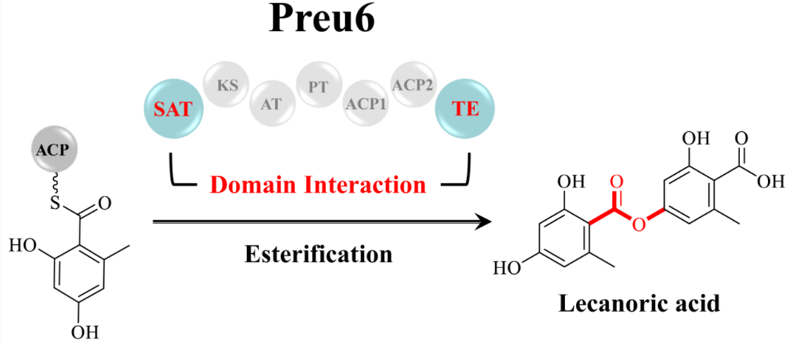 在系列前期研究工作基础上,团队进一步鉴定了具有重要生物活性和商业应用价值的苔色酸二聚体红粉苔酸的合成相关聚酮合酶Preu6,但其酯键形成机制尚未见报道。因此,该研究工作通过采用结构域交换、氨基酸定点突变、结构域拆分与重组等技术,揭示了一种全新的真菌聚酮合酶催化红粉苔酸酯键形成的酶学机制,即参与链起始的起始酰基转移酶结构域(SAT)与参与链终止和产物释放的硫酯酶结构域(TE)之间罕见的相互作用催化酯键形成,这将为苔色酸类天然产物的分子结构多样性创制和基因工程改造提供了重要的科学依据。