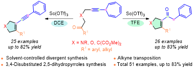 我院杨金明教授课题组设计、合成了一类新颖的1,5-炔基环庚三烯酮类底物,通过路易斯酸催化进行分子内环化反应,成功合成了一系列2,5-二氢吡咯类化合物。反应具有良好的底物普适性,通过改变溶剂条件,可以选择性地合成不同官能团化的2,5-二氢吡咯化合物(图2)。此外,该反应也能够以克级规模放大及进一步后期官能团化(Late-Stage Functionalization,LSF)。作者通过控制实验和同位素标记实验,提出了反应的机理。该研究工作共合成了23个3-苯乙炔基2,5-二氢吡咯、24个3-苯乙酰基-2,5-二氢吡咯新化合物,最高收率可达83%,此外,碳连接和氧连接底物也能应用到这一体系中。相关新化合物的生物活性评价正在进一步研究中。