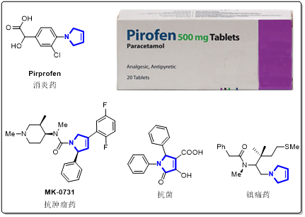 2,5-二氢吡咯衍生物作为一类重要的含氮五元杂环化合物,其结构广泛存在于具有生物活性的天然产物及药物分子中,有着良好的生物活性,例如:抗炎、抗肿瘤、抗菌、镇痛等(图1)。由于具有良好的药理学特性,2,5-二氢吡咯及其衍生物倍受研究人员的关注,因此,发展简便高效的2,5-二氢吡咯类化合物合成方法具有重要意义。