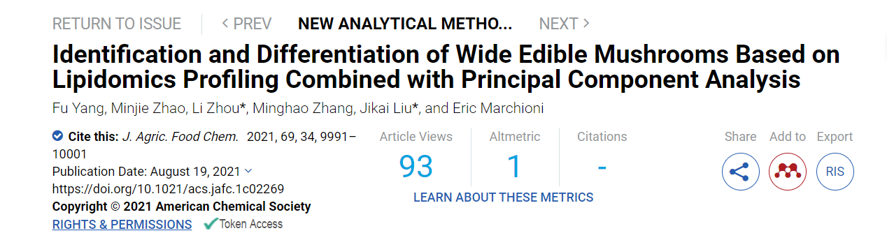 8月19日,国际期刊《Journal of Agricultural and Food Chemistry》在线刊登了必赢国际437官网药学院题为“Identification and differentiation of wild edible mushrooms based on lipidomics profiling combined with principal component analysis”的封面文章。硕士研究生杨富为论文第一作者,周莉副教授和刘吉开教授为通讯作者。