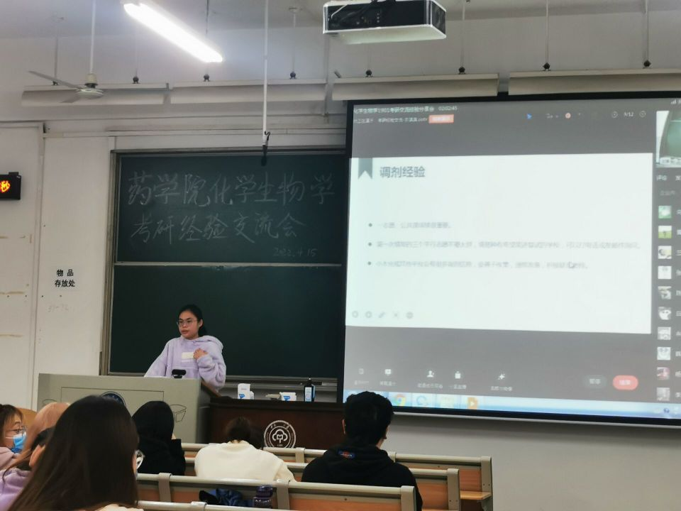 4月15日,药学院化学生物学1901班在11-210教室召开考研经验交流会。交流会由化学生物学1801班周雨璇同学主持。化学生物学系多名教师参会。