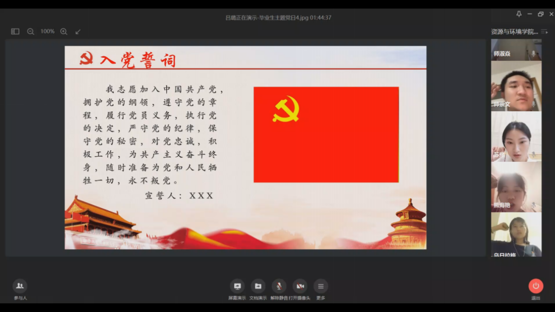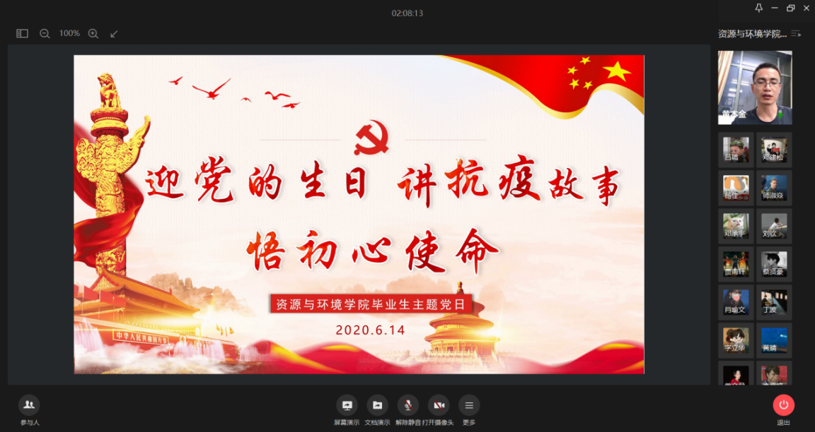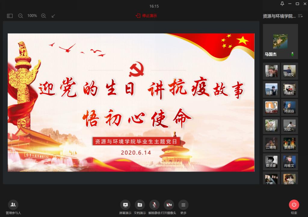6月14日晚,资源与环境学院本科学生党支部在企业微信中举行线上“迎党的生日、讲抗疫故事、悟初心使命”主题党日活动。学院党委书记马国杰、专职组织员杨海峰、副书记黄本金、支部书记吕璐、黄晴、全体本科党员和部分入党积极分子参加了本次主题党日活动,活动由吕璐老师主持。