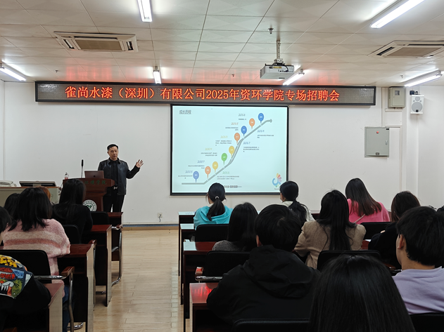 为学生搭建就业桥梁,促进人才与企业精准对接。4月3日上午,我院在13号楼261报告厅举办专场招聘会,邀请雀尚水漆(深圳)有限公司进校宣讲招聘。