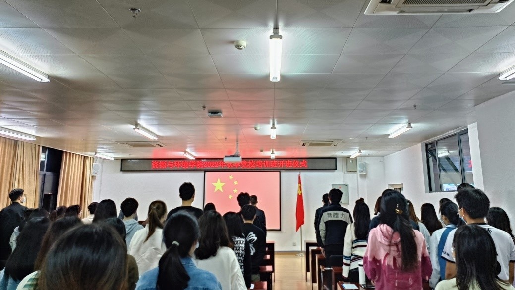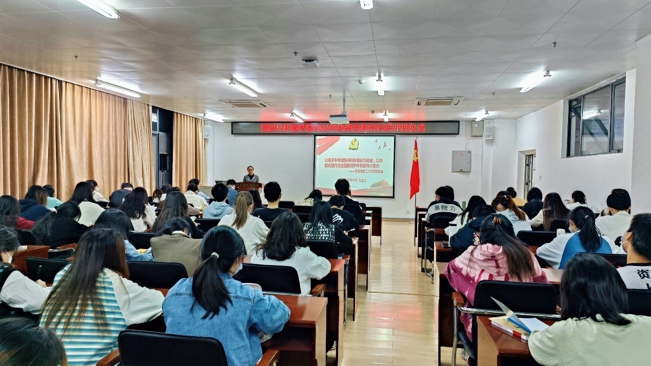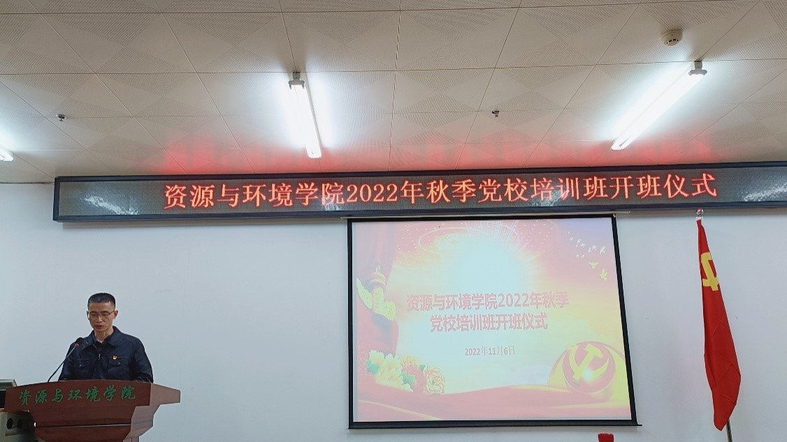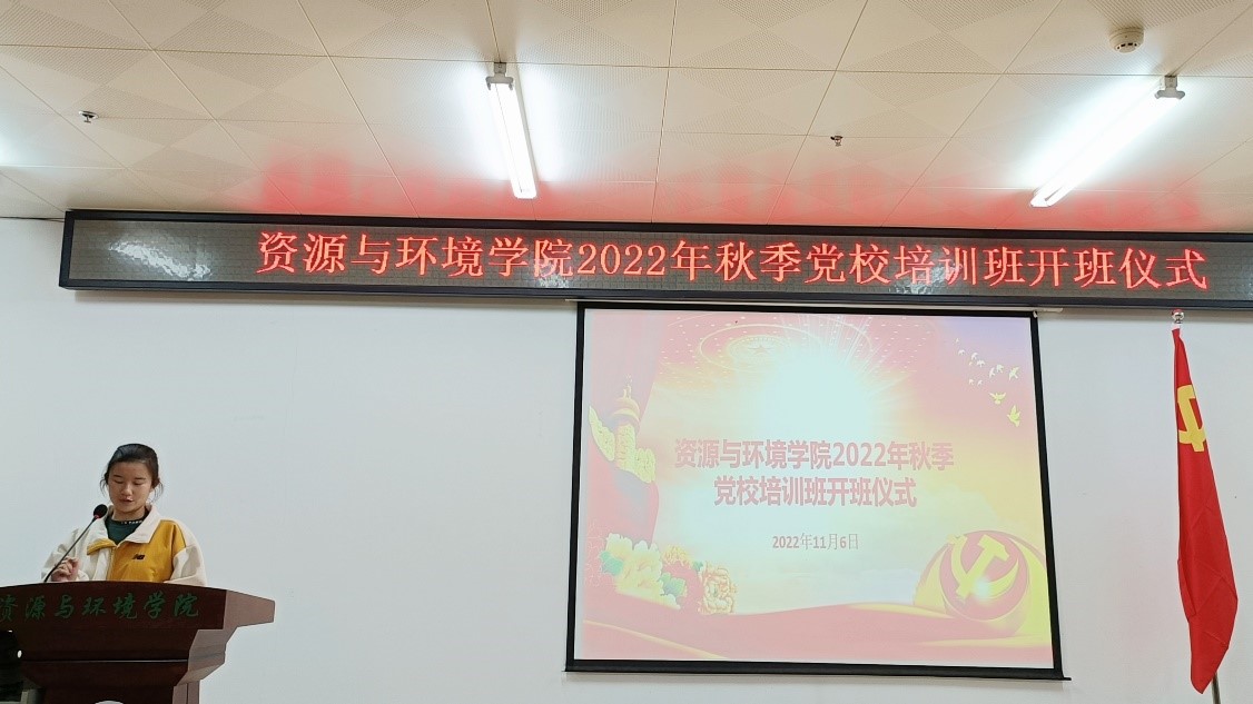 为持续掀起学习宣传贯彻党的二十大精神热潮,全面贯彻习近平新时代中国特色社会主义思想,加强对入党积极分子、发展对象和预备党员的培养和教育,引导青年学生以实际行动积极向党组织靠拢,2022年11月6日晚,资源与环境学院在13号楼261报告厅举行了2022年秋季党校入党积极分子培训班(总第94期)、发展对象培训班(总第13期)、预备党员培训班(总第14期)开班仪式暨第一讲。学院党委书记马国杰、副书记黄本金、党支部书记张俊、党支部书记刘瑾、党校带班老师黄晴和本期党校的全体学员参加了开班仪式。此次开班仪式由党校带班老师黄晴主持。