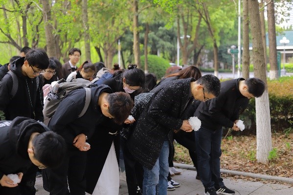 随后,全体成员肃立默哀一分钟,接着师生一道向吴泽霖先生雕像三鞠躬,献上一对花篮和师生们亲手制作的白花,以表达深深感激和无限哀思之情。