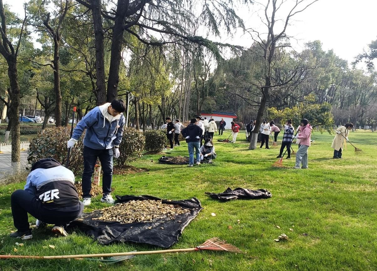 随后,在园区负责人科普基础知识并强调注意事项后,同学们以小组为单位排队领取铁锹、水桶等工具,分头清理树叶、松土浇水,现场分工明确,有条不紊。