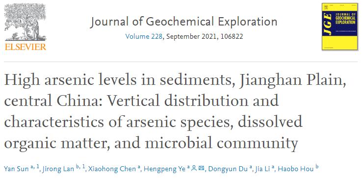 2021年5月,我院杜冬云教授课题组在地球科学类期刊《Journal of Geochemical Exploration》发表了题为《High arsenic levels in sediments, Jianghan Plain, Central China: Vertical distribution and characteristics of arsenic species, dissolved organic matter, and microbial community》的最新研究成果。研究生孙燕为该论文的第一作者,叶恒朋教授为通讯作者。