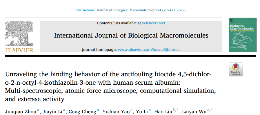 2024年6月,我院碳与环境修复团队在化学领域权威期刊《International Journal of Biological Macromolecules》(中科院一区 TOP)上发表最新研究成果:Unraveling the binding behavior of the antifouling biocide 4,5-dichloro-2-n-octyl-4-isothiazolin-3-one with human serum albumin: Multi-spectroscopic, atomic force microscope, computational simulation, and esterase activity,首次解析Sea-Nine 211防污剂主成分——4,5-二氯-2-正辛基-3-异噻唑啉酮(DCOIT)与人体主要转运蛋白——人血清白蛋白(HSA)的相互作用。我院硕士研究生周俊锹为论文第一作者,吴来燕副教授为论文通讯作者。