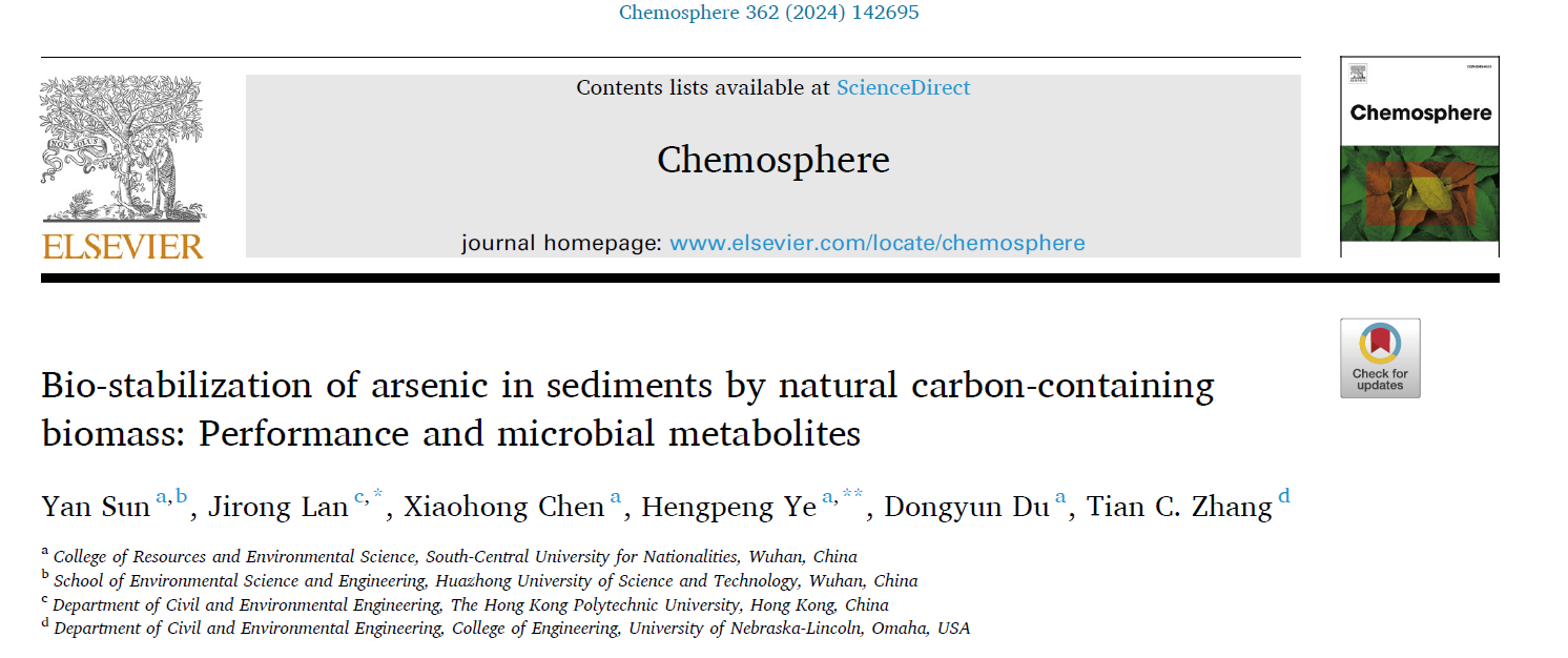2024年6月23号,我院杜冬云教授团队叶恒朋教授在《Chemosphere》(中科院二区TOP,影响因子8.1)发表了题为《Bio-stabilization of arsenic in sediments by natural carbon-containing biomass: Performance and microbial metabolites》的最新研究成果。我院研究生孙燕(现华中科技大学博士生)为第一作者,叶恒朋教授和香港理工大学蓝际荣助理研究员为论文通讯作者,必赢国际437官网为成果的第一单位。