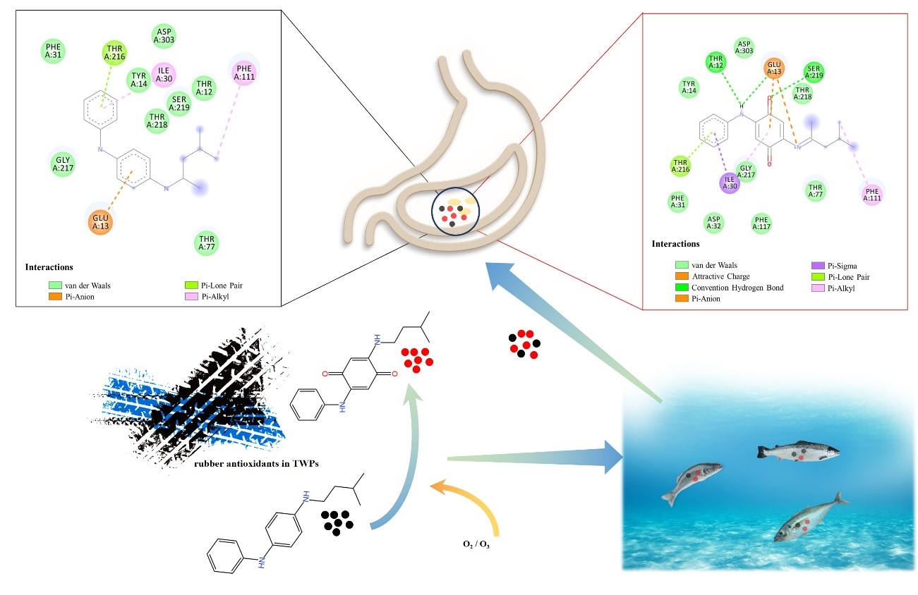 6PPD/6PPD-Q进入人体后,先与消化道内的关键酶PEP作用。本研究通过多种光谱学方法和计算机模拟技术揭示了6PPD及6PPD-Q与PEP的作用过程。研究发现6PPD/6PPD-Q在氢键和范德华力的驱使下自发地与PEP结合,这种结合行为会使PEP的光谱特性及分子结构发生改变,从而抑制PEP正常的生理活性。该研究阐明了6PPD及其代谢产物6PPD-Q与生物体内关键酶PEP的相互作用机制,将为有效评估其生态风险和健康危害提供科学依据。此外,该成果预期将为此类污染物的环境质量标准的制定及毒性评估体系的完善提供理论支撑或实践指导。