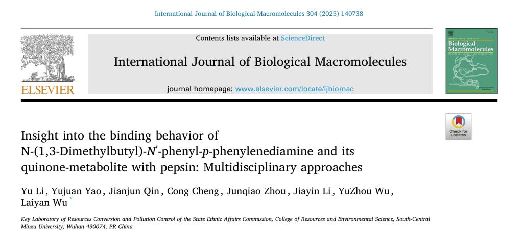 2025年2月,我院碳与环境修复孙杰教授团队的研究揭示了N-(1,3-二甲基丁基)-N'-苯基对苯二胺(6PPD)及N-(1,3-二甲基丁基)-N'-苯基对苯二胺-醌(6PPD-Q)与胃蛋白酶(PEP)的结合机理,研究成果以Insight into the binding behavior of N-(1,3-Dimethylbutyl)-N′-phenyl-p-phenylenediamine and its quinone-metabolite with pepsin: Multidisciplinary approaches为题发表于化学领域权威期刊《International Journal of Biological Macromolecules》(中科院一区 TOP)。我院本科生李钰为第一作者,吴来燕副教授为论文通讯作者。