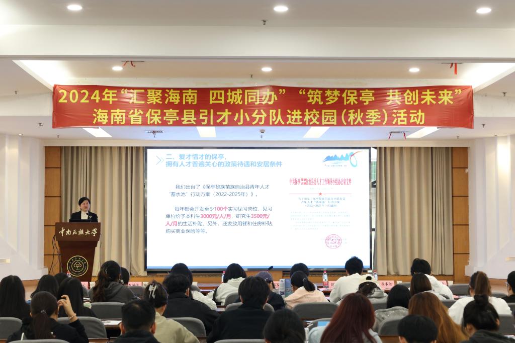 据悉,海南省保亭县引才小分队进校开展了2024年“汇聚海南 四城同办”“筑梦保亭 共创未来”秋季宣讲活动,带来192个就业岗位,其中包含事业编岗位25个,国企编制岗位39个,并在必赢官网一、二食堂之间设置招聘栏位,解答学生对单位招聘的相关问题。